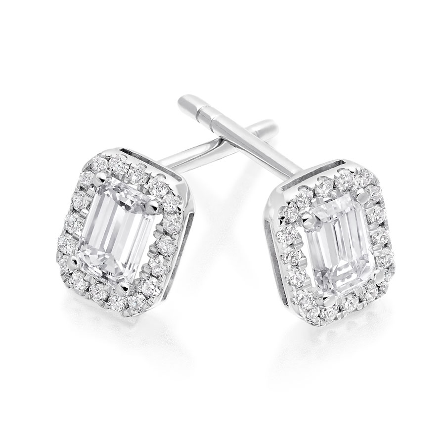 18ct white gold stud earrings consisting of 0.70 carat of diamonds. Round brilliant cut diamonds surrounding a central emerald cut diamond in a claw setting.